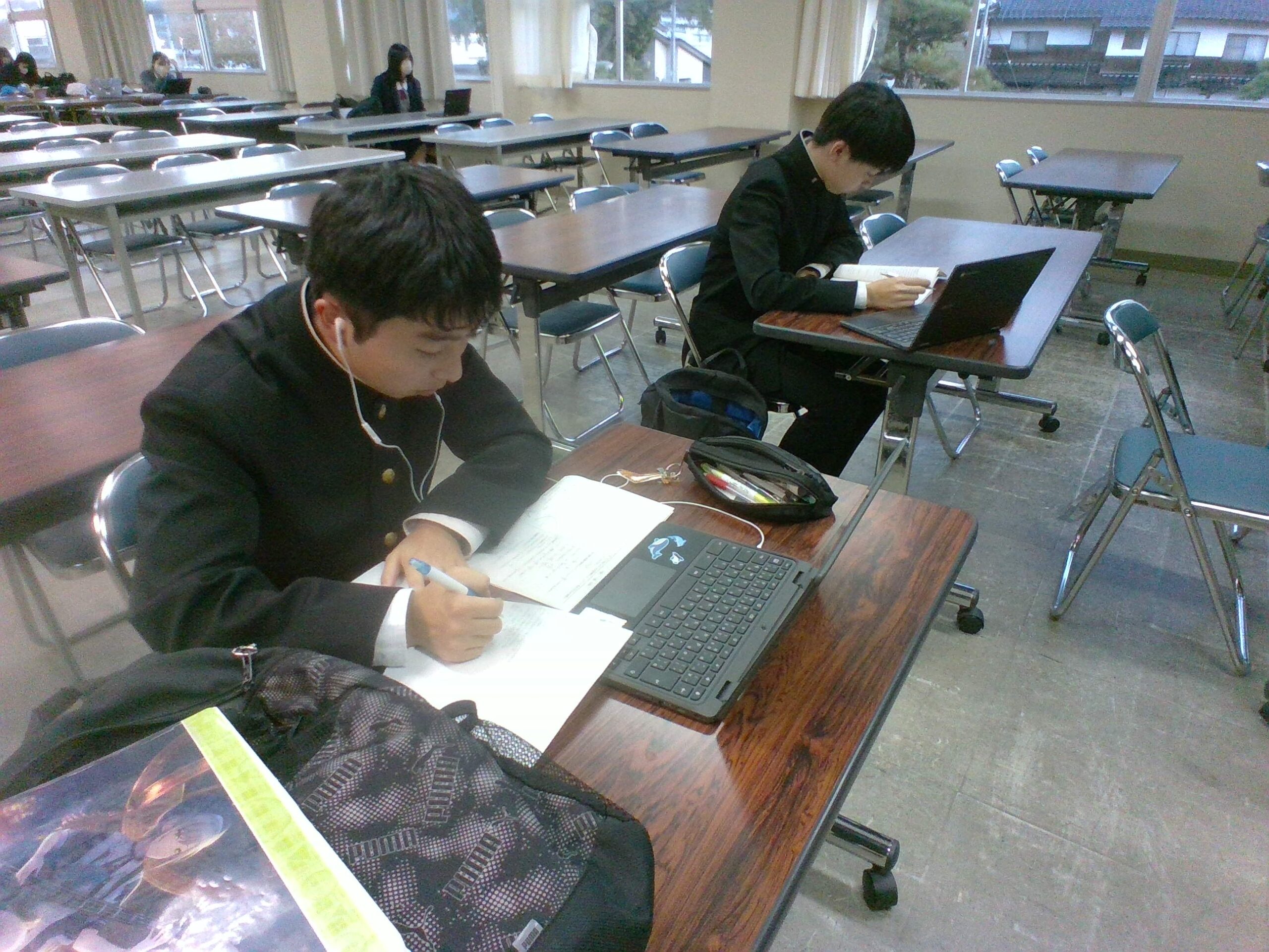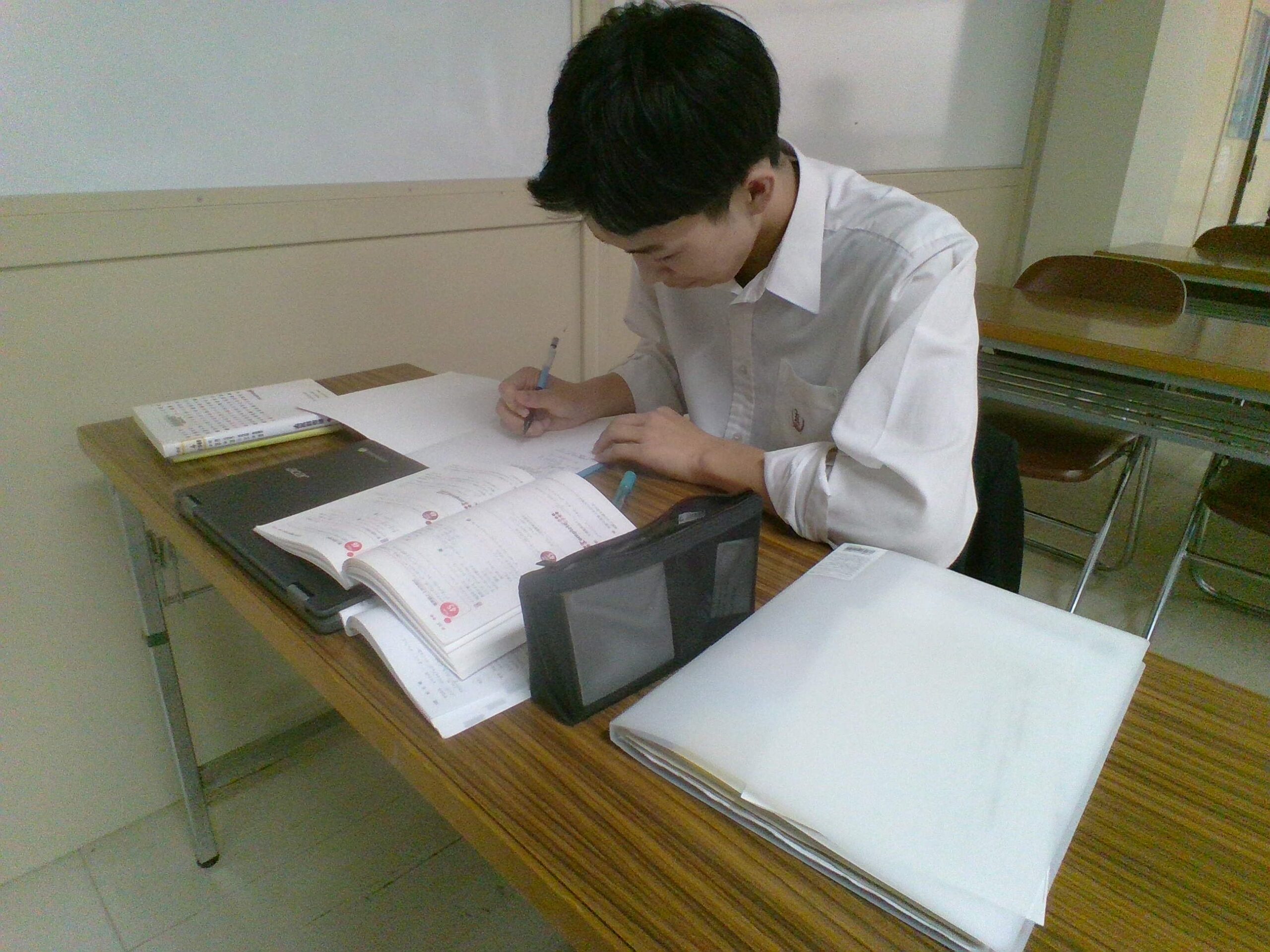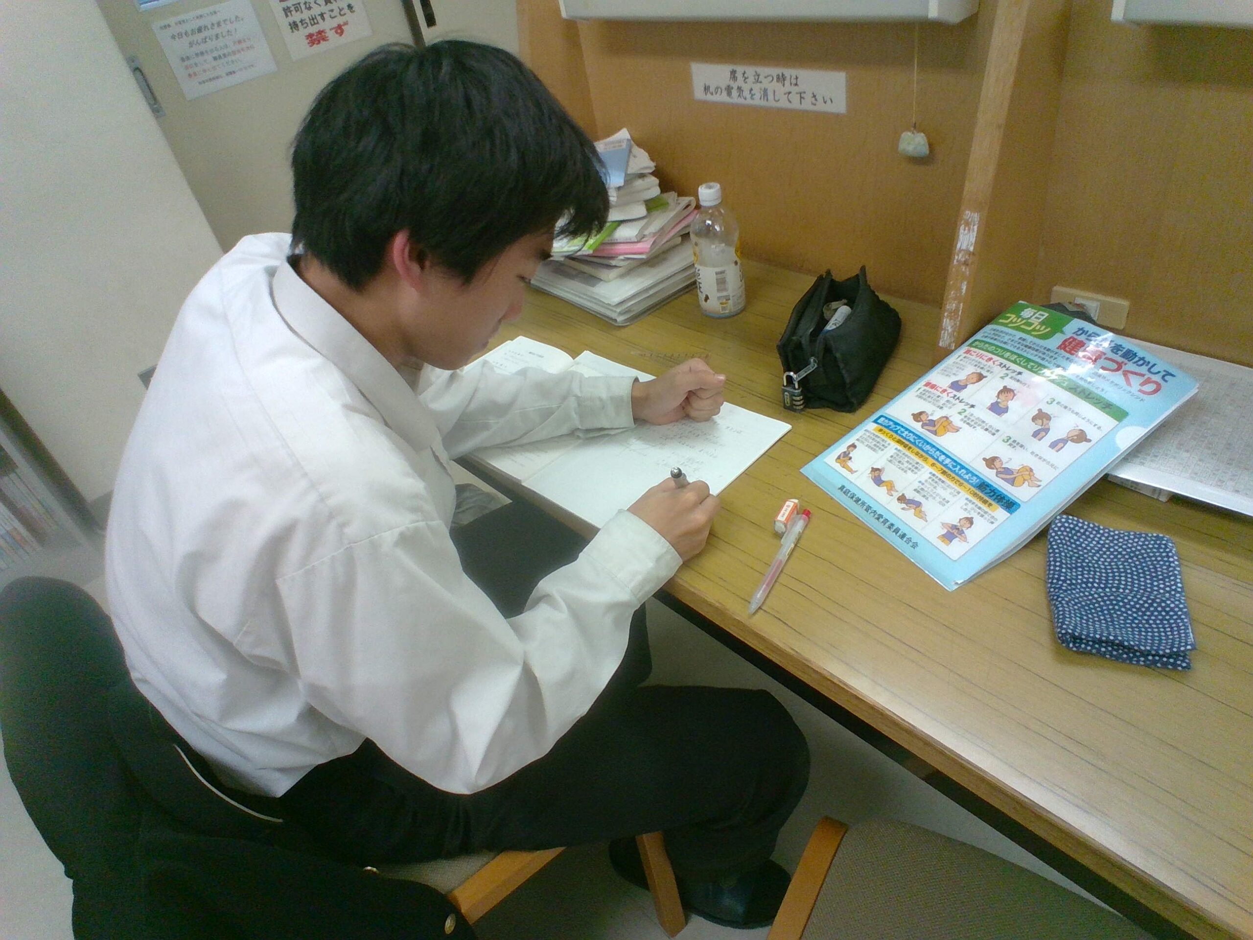 グラウンドや体育館から運動部の生徒たちの元気な声が聞こえる中、第3棟から吹奏楽部が練習に励む楽器の音が聞こえる中、本日も職員室の横では静かに自己の目標に向け頑張る人たちがいます。