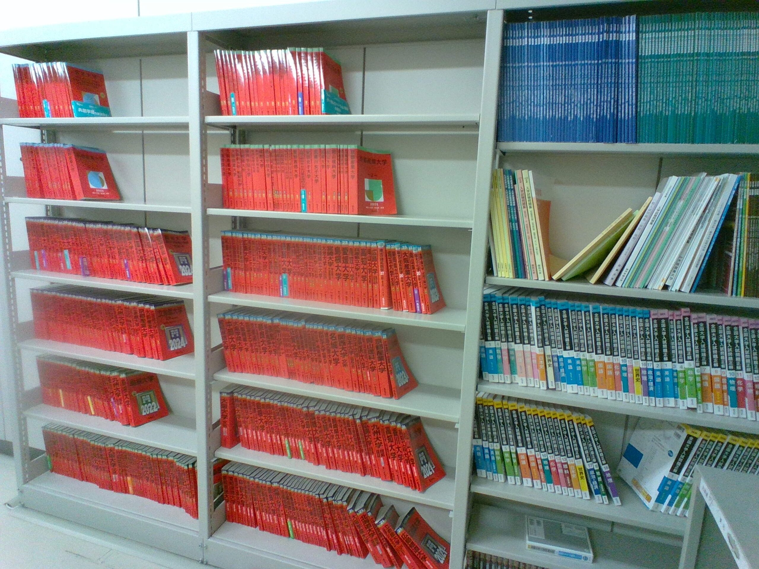 その隣には自習室があります。ここには各大学の赤本や大学入試の過去問集などがあるだけでなく、個々の学習スペースも整備されています。会話はできませんが、みな集中して勉強していました。