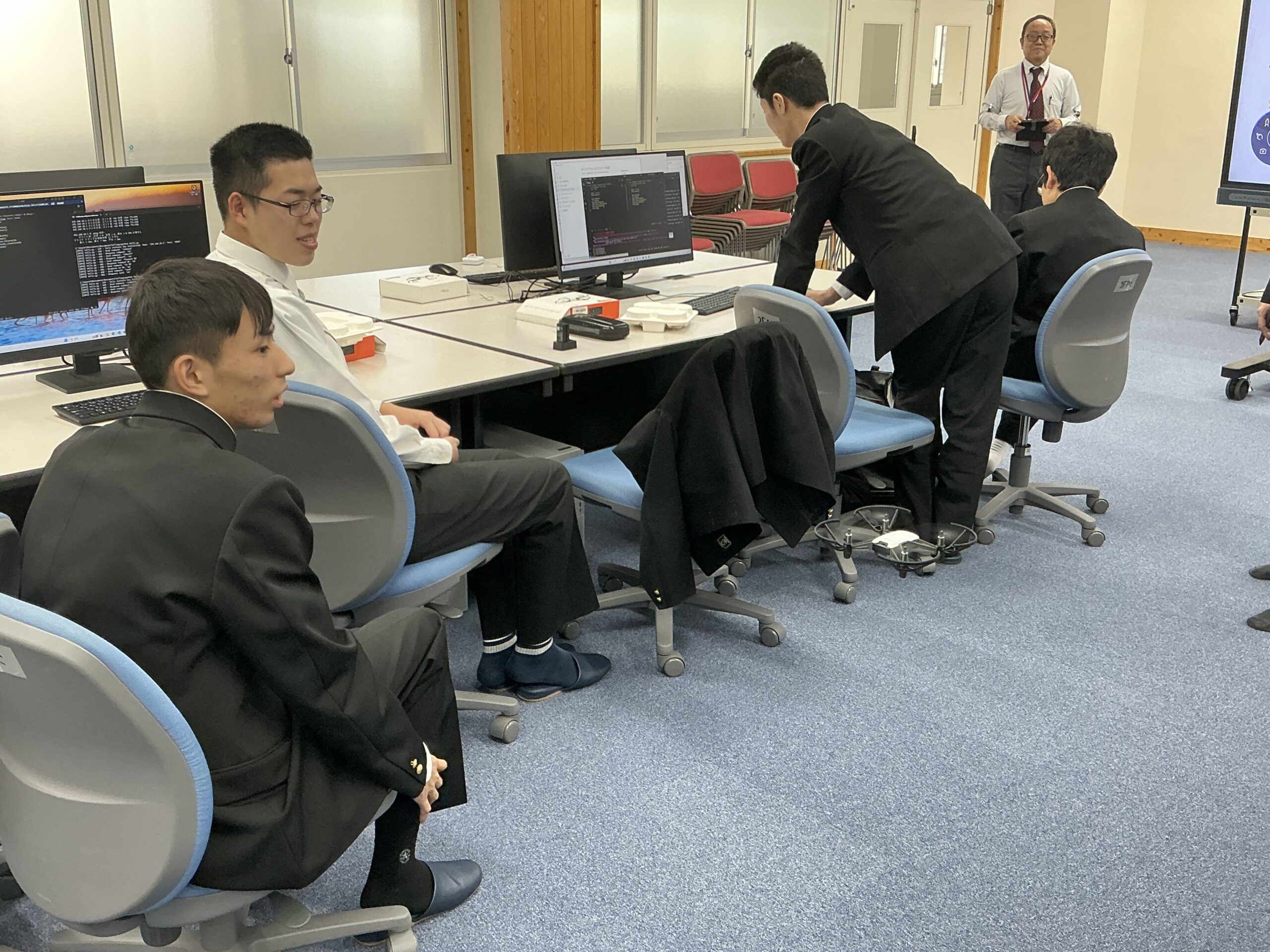 文科省指定事業のDX人材育成事業の一つとして、『ドローンをプログラミングして飛ばそう!』を全4回の講座で実施しています。講師は津山工業高等専門学校から森理也先生をお招きしました。対象は本校サイエンスDX部の部員たち6名です。