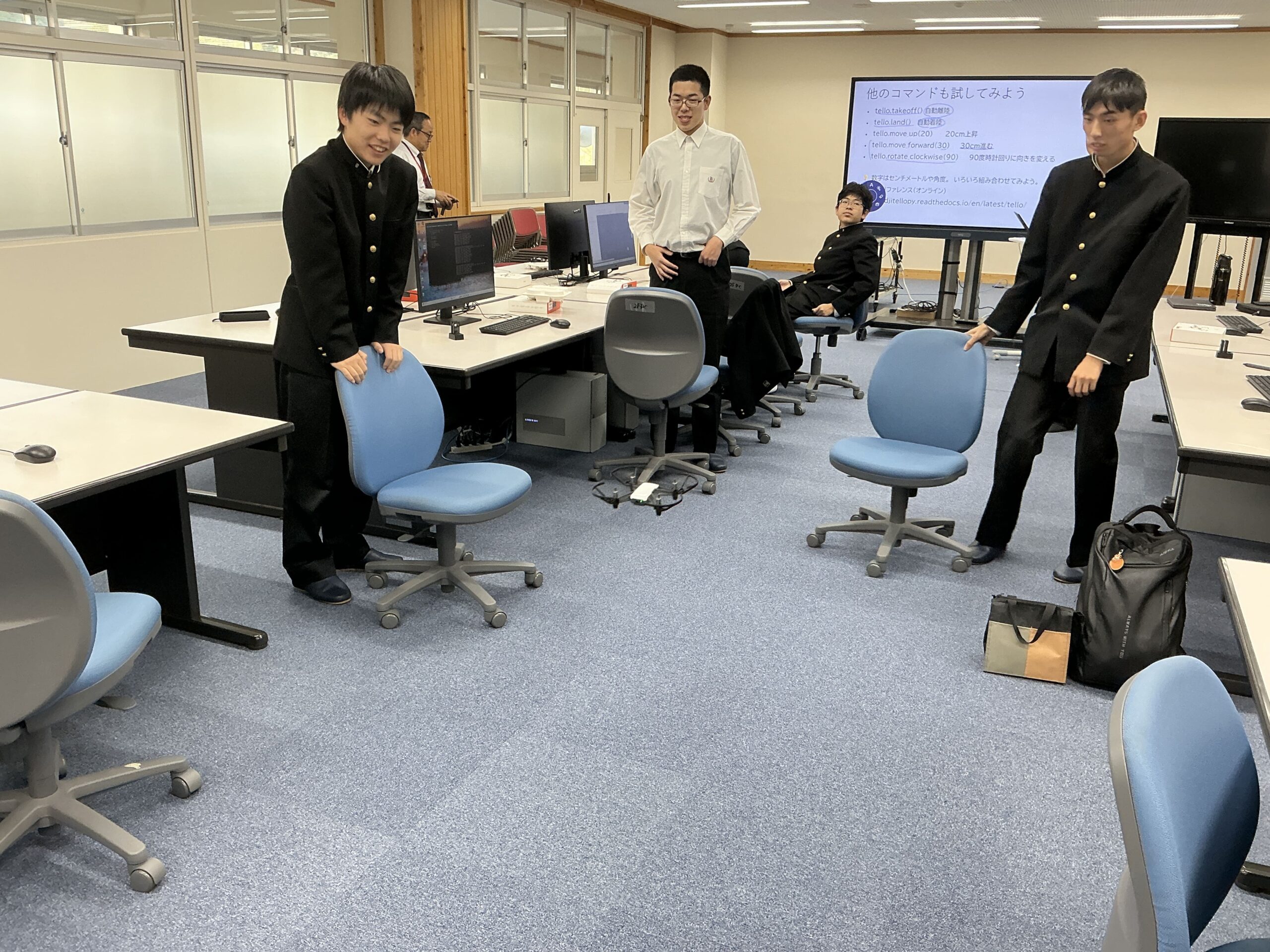 第1回は設定から簡単な命令で「上昇して5秒間静止、その後着地する」を実行するまで、でした。6台中、1台だけしか飛ばせなかったけれど、飛ぶと感動!