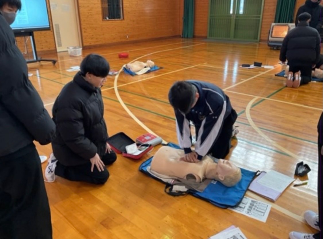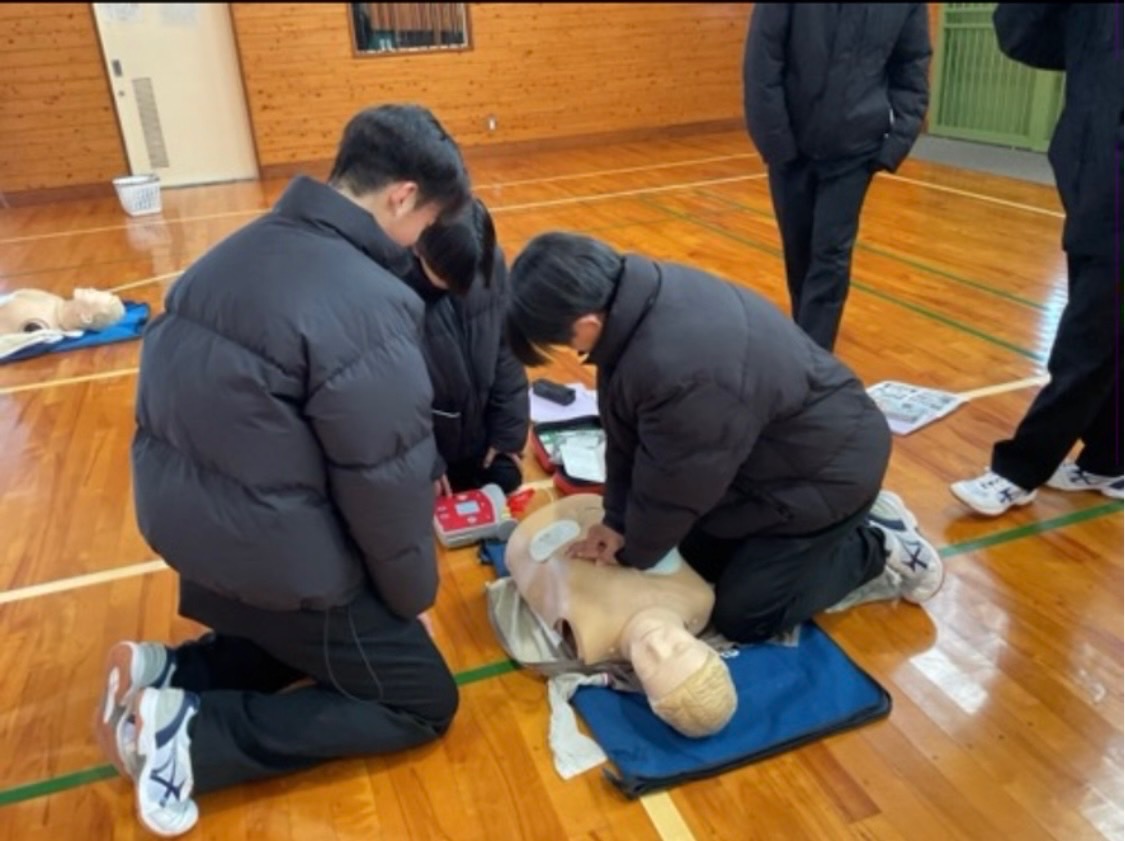 先日1年次生の「保健」の授業で、生徒たちが心肺蘇生法を学びました。