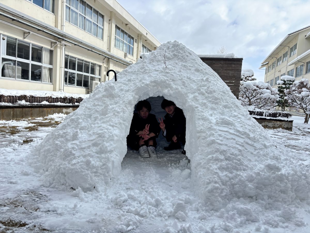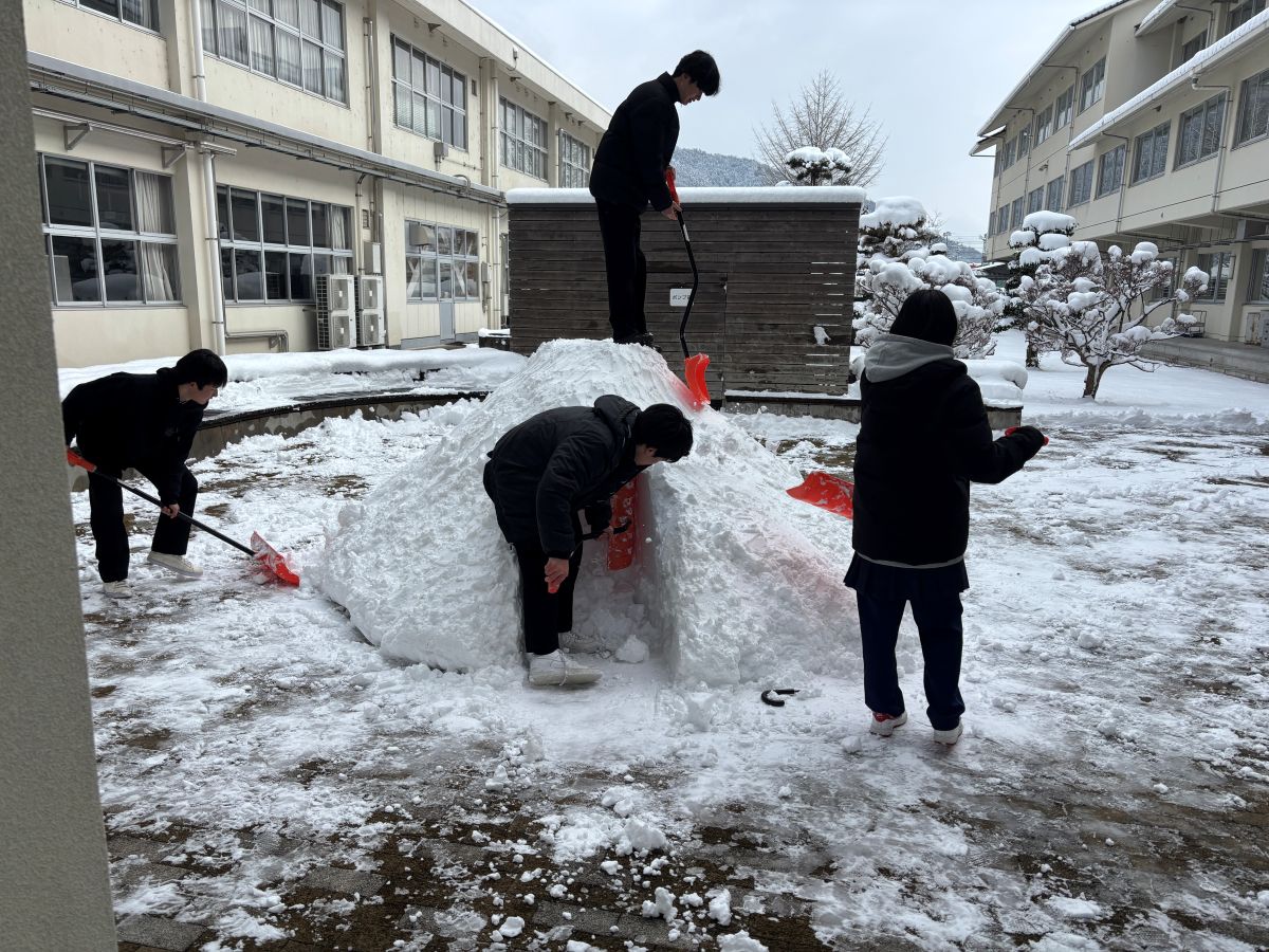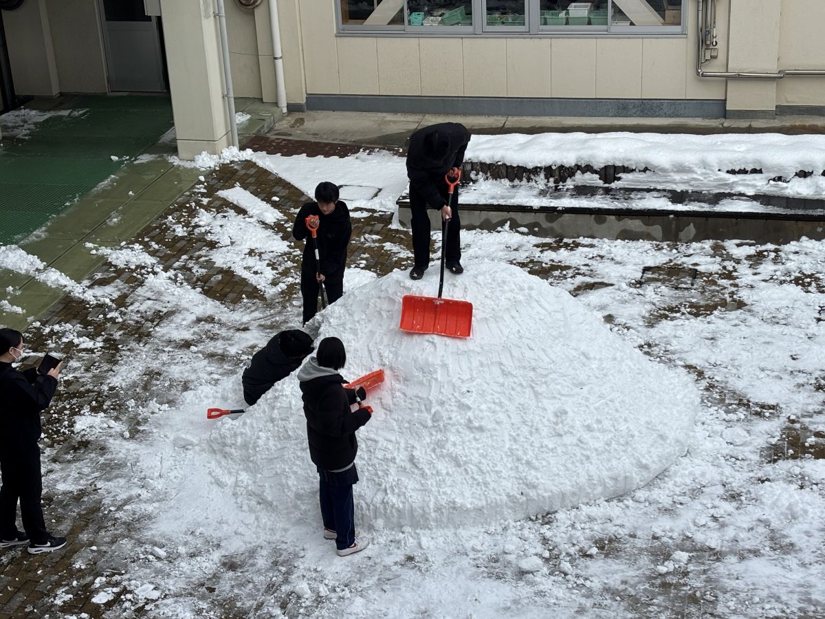 一部の生徒は中庭の雪に触れていたようです。「どうやったら思い通りに作れるだろう」と考えながら、試行錯誤する様子が印象的でした。帰るまでの時間で何とか一段落ついたようです。